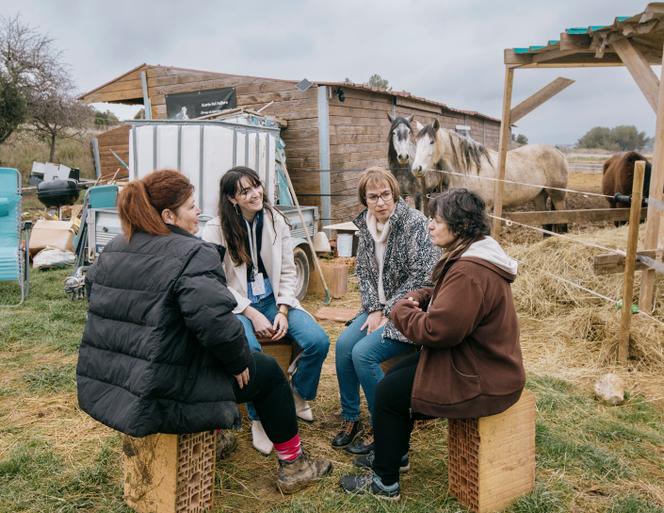 Brigitte Faure,éleveuse de brebis laitière (à droite),et Carole Iskhakov (de dos,à gauche),éleveuse de chevaux,échangent avec Estelle Rouvière (de face,chargée de développement social à la MSA Languedoc,et Karine Archambaud (de face,à droite),assistante sociale au sein de la même MSA,sur le terrain de Carole,à Popian (Hérault),le 20 février 2025. SANDRA MEHL POUR « LE MONDE » Pour amener de l’eau à ses chevaux,Carole Iskhakov a mis en place un système D. Chaque jour,elle doit prendre sa voiture,à laquelle elle a attaché une remorque avec une grande cuve retenue par des sangles. Pour aller chercher la précieuse ressource,elle emprunte les chemins de terre boueux à travers les parcelles de vignes – où le véhicule manque de s’enliser – et les petites routes de campagne. Agée de 53 ans,cette agricultrice installée à Saint-Bauzille-de-la-Sylve (Hérault),au milieu des vignes,démontre un moral d’enfer et un enthousiasme à toute épreuve. « Heureusement ! Sinon je n’aurais pas tenu longtemps dans ce milieu »,affirme-t-elle.