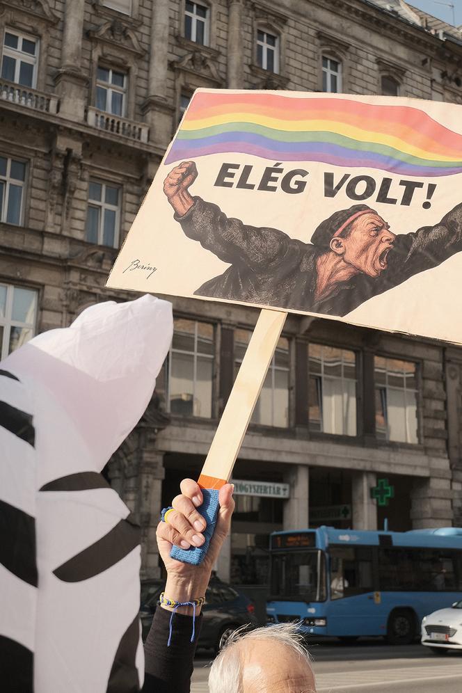Lors du rassemblement de protestation du 22 avril,à Budapest. « Ça suffit ! » est-il inscrit sur la pancarte,qui s’inspire d’une célèbre affiche révolutionnaire de 1919,par Róbert Berény. ANNA KERESZTY POUR M LE MAGAZINE DU MONDE Akos Modolo,30 ans,a longtemps pensé que,en Hongrie,manifester ne servait à rien. Pourtant,le 18 mars,au lendemain du vote de la loi interdisant la Marche des fiertés dans le pays,ce militant des droits LGBTQ + s’est rendu au premier rassemblement organisé sur le pont Élisabeth,dans la capitale. Il l’a fait avec « un peu de scepticisme »,explique-t-il le 25 avril,à l’étage d’un café du centre-ville,chemise bleue et cheveux coiffés au gel. « J’avais le sentiment que le gouvernement nous volait notre cœur,notre événement le plus précieux,détaille cet ancien responsable des ressources humaines,salarié dans plusieurs multinationales basées en Hongrie. Je suis allé marcher pour le symbole,sans imaginer que ça pourrait changer quoi que ce soit à la législation imposée par le pouvoir. »
