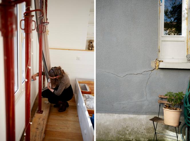 Marie Le Mélédo est parmi les plaignants qui attaquent l’Etat pour manquement face au dérèglement climatique. Son studio des Lilas (Seine-Saint-Denis) est inhabitable à la suite de mouvement de terrain. Les Lilas,le 31 mars. AGNES DHERBEYS/MYOP POUR «LE MONDE» C’était l’endroit où elle s’imaginait vieillir avec ses chats : un coquet studio donnant sur un carré de verdure,dans une calme cour d’immeuble des Lilas (Seine-Saint-Denis). Elle l’avait fait entièrement rénover,le décorant de meubles aux tons clairs pour l’inonder de lumière. Mais de retour de vacances,à l’été 2020,Marie Le Mélédo découvre son appartement sinistré. Les portes et les fenêtres ne s’ouvrent plus,le sol s’est enfoncé,et de multiples fissures balafrent les murs. Le bâtiment est rapidement classé en arrêté de péril. Après la « panique » débute un « enfer »,raconte l’experte en agroécologie,âgée de 37 ans,désignant le pied-de-biche qui lui servait à entrer et sortir de chez elle et les étais soutenant le plafond.