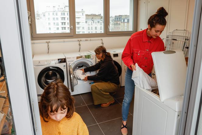 Dans la buanderie partagée de l’immeuble coopératif UTOP,rue Sorbier,à Paris,le 1ᵉʳ juin 2024. ARNAUD DUMONTIER/LE PARISIEN/MAXPPP C’est un élégant immeuble blanc paré de bois,flambant neuf,au pied du métro Gambetta,dans le 20e arrondissement de Paris. Rien ne le distingue d’autres bâtiments voisins vu de l’extérieur,mais,à l’intérieur,tout y est singulier. Dans le hall d’entrée,sur un grand tableau,les sorties des poubelles et le ménage sont programmés jusqu’à la fin janvier : les habitants ont collé l’étiquette à leur prénom (Margot,Rachid,Hugo,Vicki…) dans la case correspondant à leur semaine de corvée.