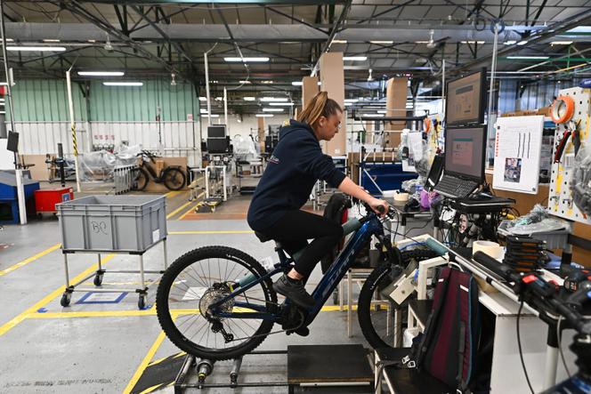 Dans l'usine de fabrication de vélo Manufacture française du cycle,à Machecoul-Saint-Même (Loire-Atlantique),le 8 avril 2025. FRANCK DUBRAY/OUEST FRANCE/MAXPPP A la sortie de Machecoul-Saint-Même (Loire-Atlantique),la plus grande usine d’assemblage de vélos de France,la Manufacture française du cycle,s’étend sur 35 000 mètres carrés. Agrandie en 2021 pour répondre à une forte demande,la surface de production n’est toujours pas,quatre ans plus tard,utilisée à plein. Trois cent mille vélos sont sortis des chaînes de montage en 2024,pour une capacité totale de 600 000 unités. L’effectif salarial de l’usine,qui assemble les engins pour la marque Intersport,reflète les mouvements de yo-yo auxquels est soumise l’industrie du cycle depuis cinq ans. « L’usine employait 650 personnes en 2021,puis 1 000 en 2022,et nous sommes redescendus à 650 »,précise David Jamin,directeur général de l’entreprise.