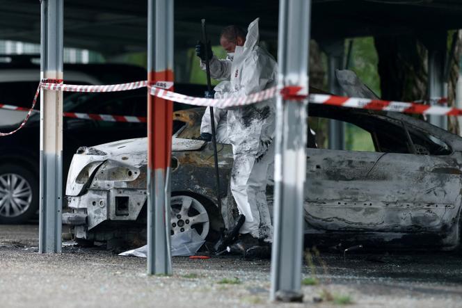 Des membres de la police scientifique inspectent des voitures incendiées sur le parking de la prison de Tarascon (Bouches-du-Rhône),le 16 avril 2025. MANON CRUZ / REUTERS La découverte,à la mi-avril,de véhicules de surveillants pénitentiaires incendiés et de prisons ciblées par des tirs,avec comme signature d’énigmatiques tags « DDPF » (« défense des droits des prisonniers français »),avait un temps laissé entrevoir le scénario d’une action liée à l’ultragauche,voire à une intervention étrangère.