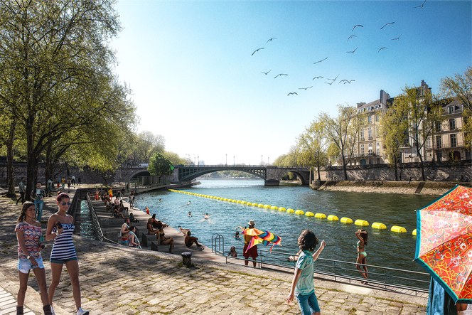 Vue d’artiste du projet de la baignade Pont-Marie,au pied du pont de Sully et face à l’île Saint-Louis,à Paris. MAIRIE DE PARIS Difficile d’imaginer que dans moins de deux mois,ici,au pied de la passerelle Simone-de-Beauvoir,en face de la Bibliothèque nationale de France,on pourra enchaîner les longueurs de brasse ou de crawl dans la Seine. « Patience,on embellit votre quartier »,mentionne un panneau de la municipalité sur une grille de chantier. Pour l’heure,une grue verte est posée sur une barge et des tubes d’acier géants (des « ducs-d’albe » dans le vocabulaire maritime) sont plantés dans le fleuve,à une dizaine de mètres du quai. C’est pourtant bien-là,juste en dessous du parc de Bercy,dans le 12e arrondissement,que sera ouvert,cet été,l’un des trois sites de baignade promis aux Parisiens en « héritage » des Jeux olympiques (JO) de 2024. Les détails pratiques ont été présentés mercredi 14 mai par la maire de Paris,Anne Hidalgo,à l’issue d’un comité de pilotage sur la qualité de l’eau de la Seine,et de la Marne où seront également inaugurées deux zones de baignade cet été.