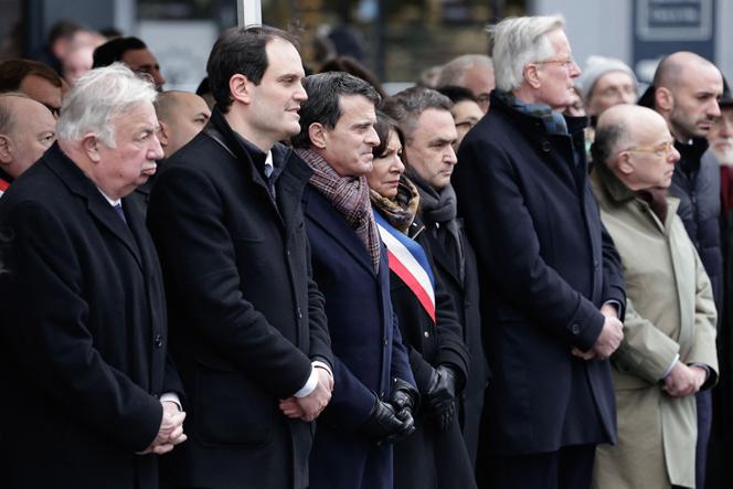 (De gauche à droite) Le président du Sénat,Gérard Larcher,le président du Conseil représentatif des institutions juives de France,Yonathan Arfi,le ministre des outre-mer,Manuel Valls,la maire de Paris,Anne Hidalgo,les anciens premiers ministres Michel Barnier et Bernard Cazeneuve se recueillent devant le supermarché Hyper Cacher,à Paris,le 9 janvier 2025. STEPHANE DE SAKUTIN/AFP Une larme discrète perle au coin de l’œil de la jeune fille. Son amie,quelques rangs derrière,l’aperçoit et lui tend un mouchoir. Toutes les deux se sourient,émues. Membres d’organisations de jeunesse juives,elles sont venues,comme d’autres,jeudi 9 janvier,commémorer devant les lieux du drame l’attentat de l’Hyper Cacher de la porte de Vincennes,qui a fait,il y a dix ans jour pour jour,quatre morts et cinq blessés.