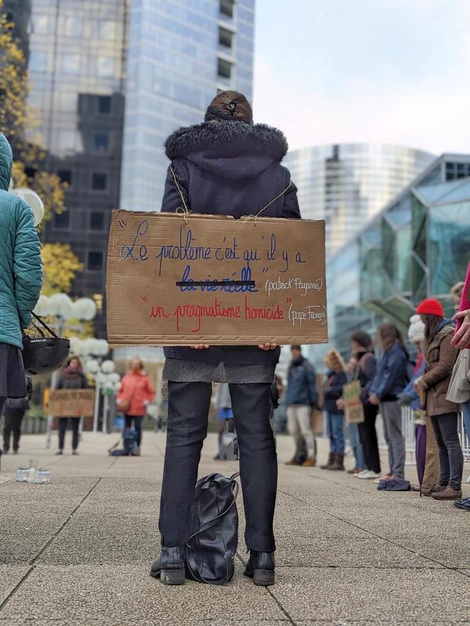 Lors d’une manifestation silencieuse devant la tour TotalEnergies,à Paris, le 7 novembre 2023. CLAIRE RIOBÉ Paris,avril 2023. Deux kilomètres après la brasserie La Rotonde en feu et un black bloc bataillant avec les forces de l’ordre,une poignée de jeunes militants déploient des tabourets devant un Abribus. Quelques minutes plus tard,les premiers manifestants arrivent à Denfert-Rochereau. Assis sur la chaussée,les membres d’Anastasis,groupe de jeunes chrétiens opposés à l’économie de marché autant qu’à une interprétation identitaire de la foi,leur cirent les chaussures.